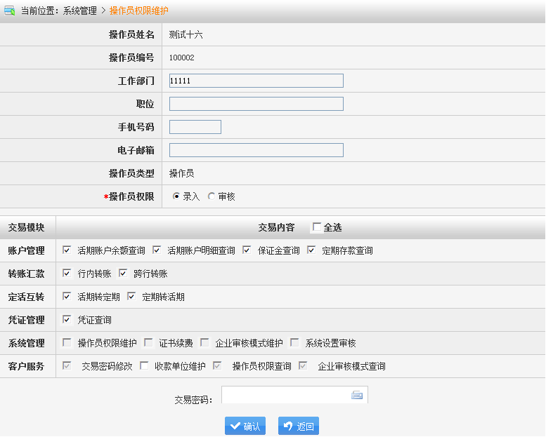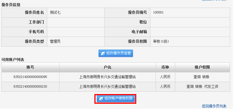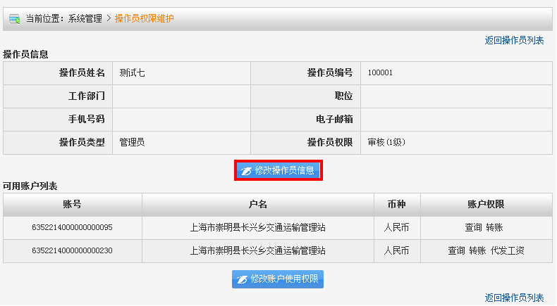 3. 点击“修改操作员信息”,进入操作员信息及权限维护界面