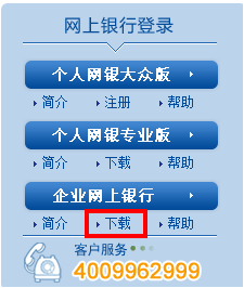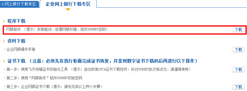 USBKey插入电脑后会自动打开我行网站,请点击左上角“企业网上银行”登录窗的“下载”: