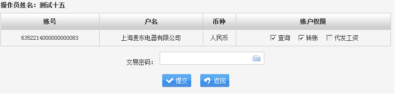 您可为制单人和审核人分配具体可以使用的账号,具有“查询”和“查询并转账”等功能。如选择“查询”,该操作员将无法办理转账业务或审核业务。