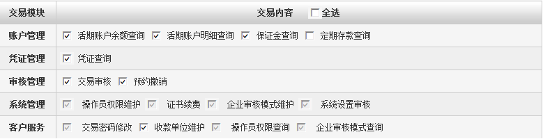 5. 分配操作员功能菜单。您可为制单人和审核人分配具体可以使用的功能,在相应功能上打勾即可。灰色已打勾的功能块在您申请开立网上银行时,系统已经默认开通,无需您选择。灰色未打勾的功能块为该类型操作员所不具备的功能和未申请开通的功能。