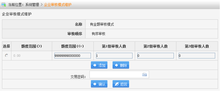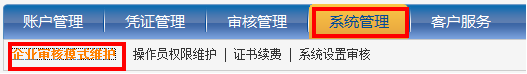 在您完成 “操作员权限维护”后,您可以对企业审核模式进行设置。(注意:请务必确认已完成操作员审核级别的设置)